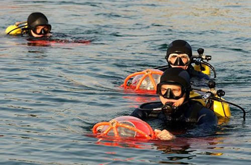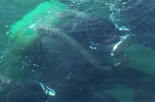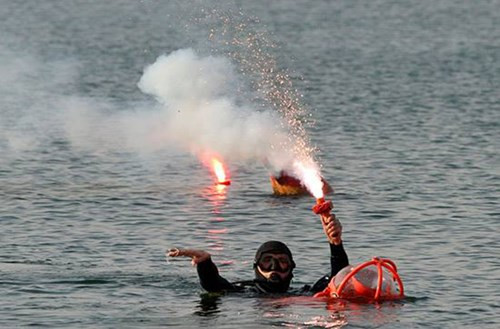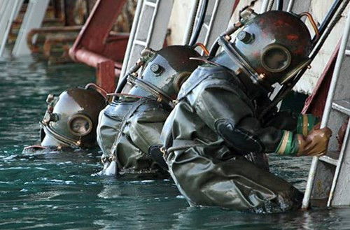 Trong ảnh là hai thợ lặn thuộc Hạm đội Biển Đen thực hiện buổi huấn luyện dưới nước của mình và để có thể chìm dưới nước mỗi thợ lặn phải mang những đôi giày có đế bằng chì nặng tới 23kg với mũi giày được làm bằng đồng.