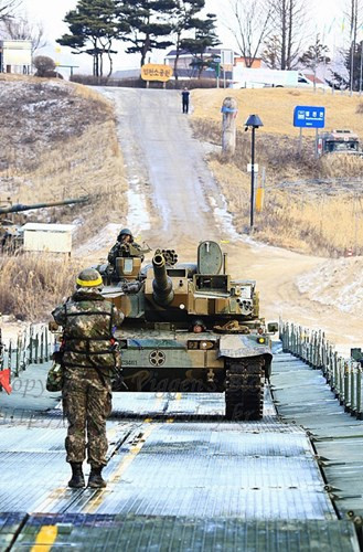 Các xe tăng K2 của Hàn Quốc đã được triển khai trong đội hình Sư đoàn bộ binh cơ giới tham gia cuộc tập trận chiến thuật tiến công địch trong mùa đông giá lạnh vào hôm 15/1 tại một địa điểm gần quận Yangpyeong, tỉnh Gyeonggi-do.
