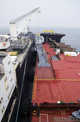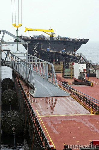 Cận cảnh binh lính hải quân trên tàu container Fred W. Stockham di chuyển lên tàu USNS Montford Point bằng ván cầu đã được gắn kết giữa hai tàu.