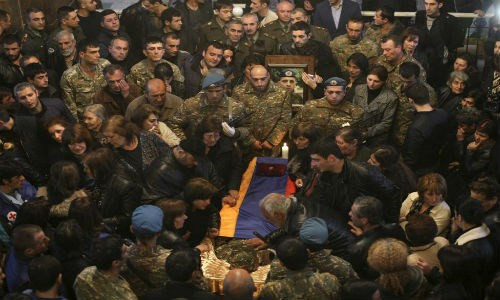 Người dân tập trung quanh quan tài của một quân nhân Armenia, người đã thiệt mạng trong cuộc xung đột ở Nagorno-Karabakh, tại một ngôi chùa ở Yerevan, Armenia, ngày 4/4.