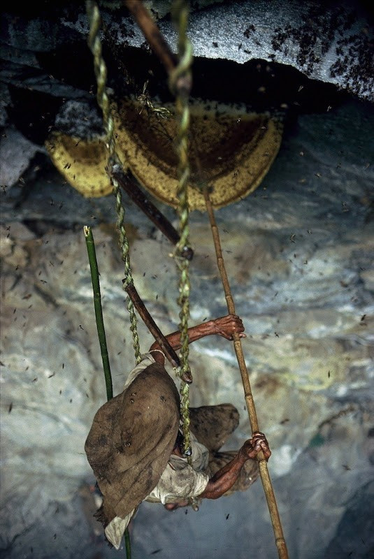 Từ vị trí phía trên, thợ săn leo thang dây xuống phía dưới. Họ mang theo sào và rổ để lấy sáp. Những người ở phía trên giữ chặt thang dây và đưa những dụng cụ theo yêu cầu của thợ săn.