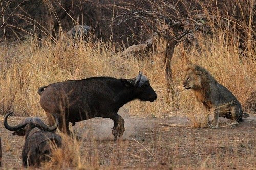 Cuộc hỗn chiến giữa sư tử và trâu rừng bắt đầu khi con trâu rừng bị sư tử đói gần đó nhắm tới, lao vào tấn công với hy vọng có bữa trưa no nê.