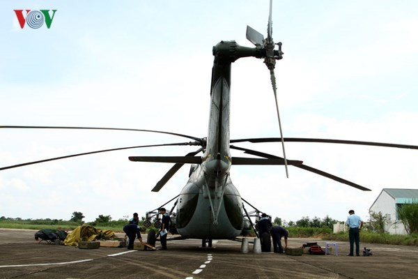 Nhân viên kỹ thuật lắp rocket vào thùng phóng treo trên trực thăng Mi.