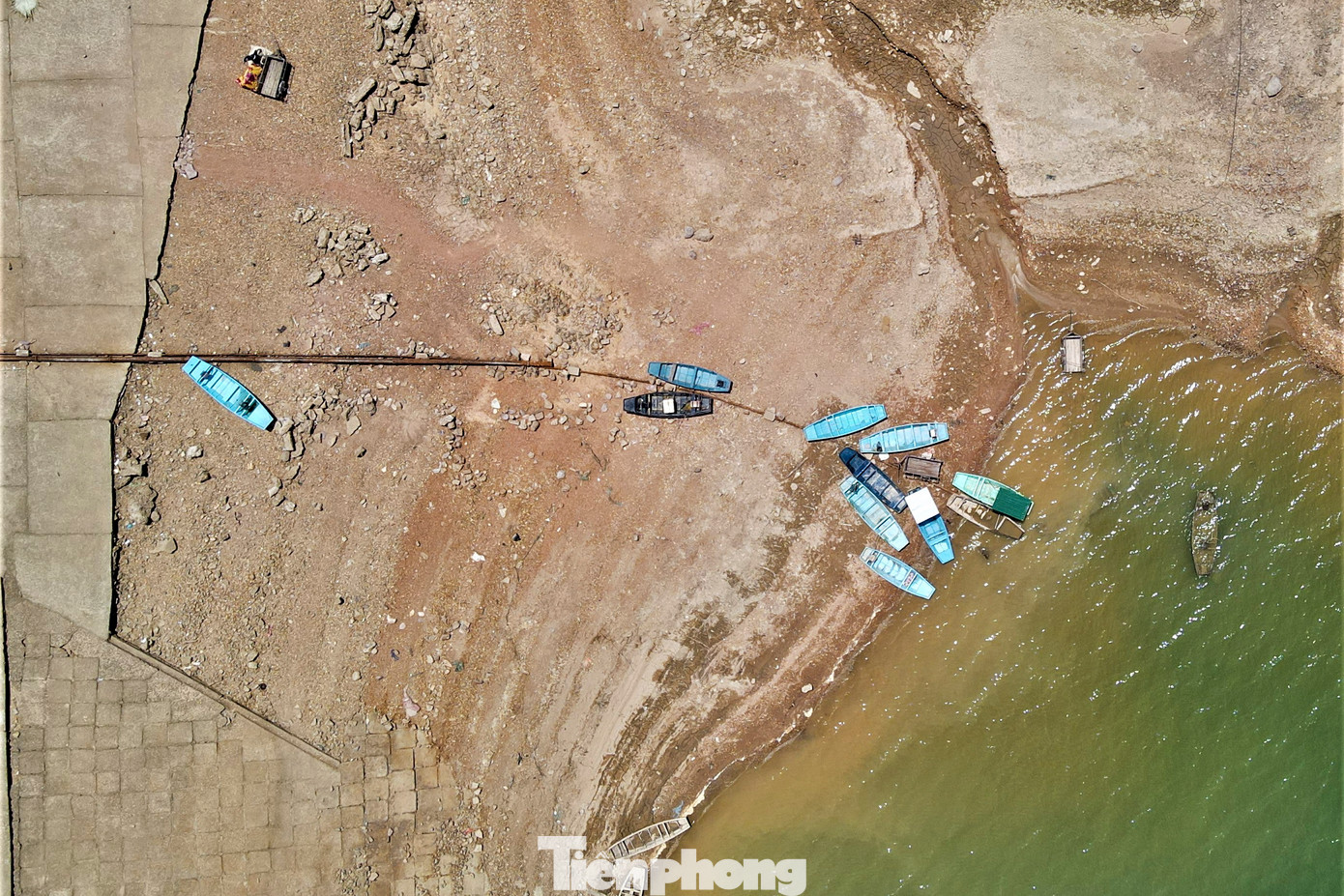 Nhìn từ trên cao, nhiều khu đất trong lòng hồ hiện rõ khi mực nước hồ xuống thấp.
