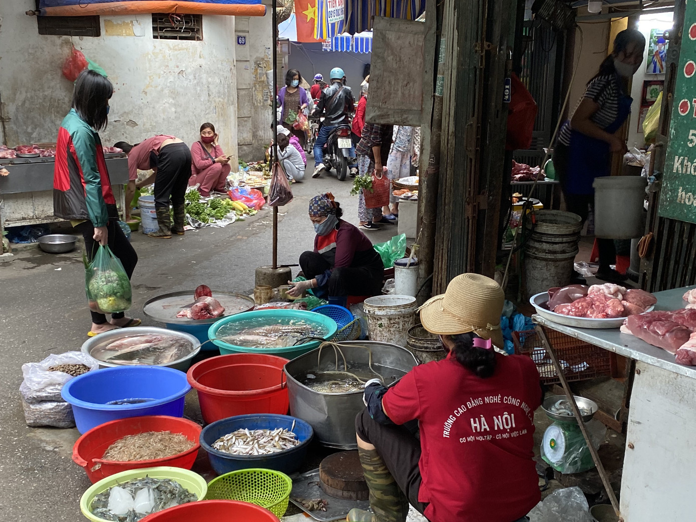Buổi chợ sáng 1/2 Âm lịch, các chợ truyền thống tại Hà Nội bắt đầu đông khách từ 7 giờ. Không còn chạy đua với thời gian cho kịp giờ đi làm, hầu hết các mẹ, các chị em nội trợ đều có thêm thời gian lựa đồ, sắm lễ. Không cầu kỳ như mâm lễ Rằm tháng Giêng vừa qua, mùng 1, chủ yếu hoa tươi, hoa quả đắt hàng. Thực phẩm chế biến sẵn, xôi, gà “vắng bóng” tại các chợ.