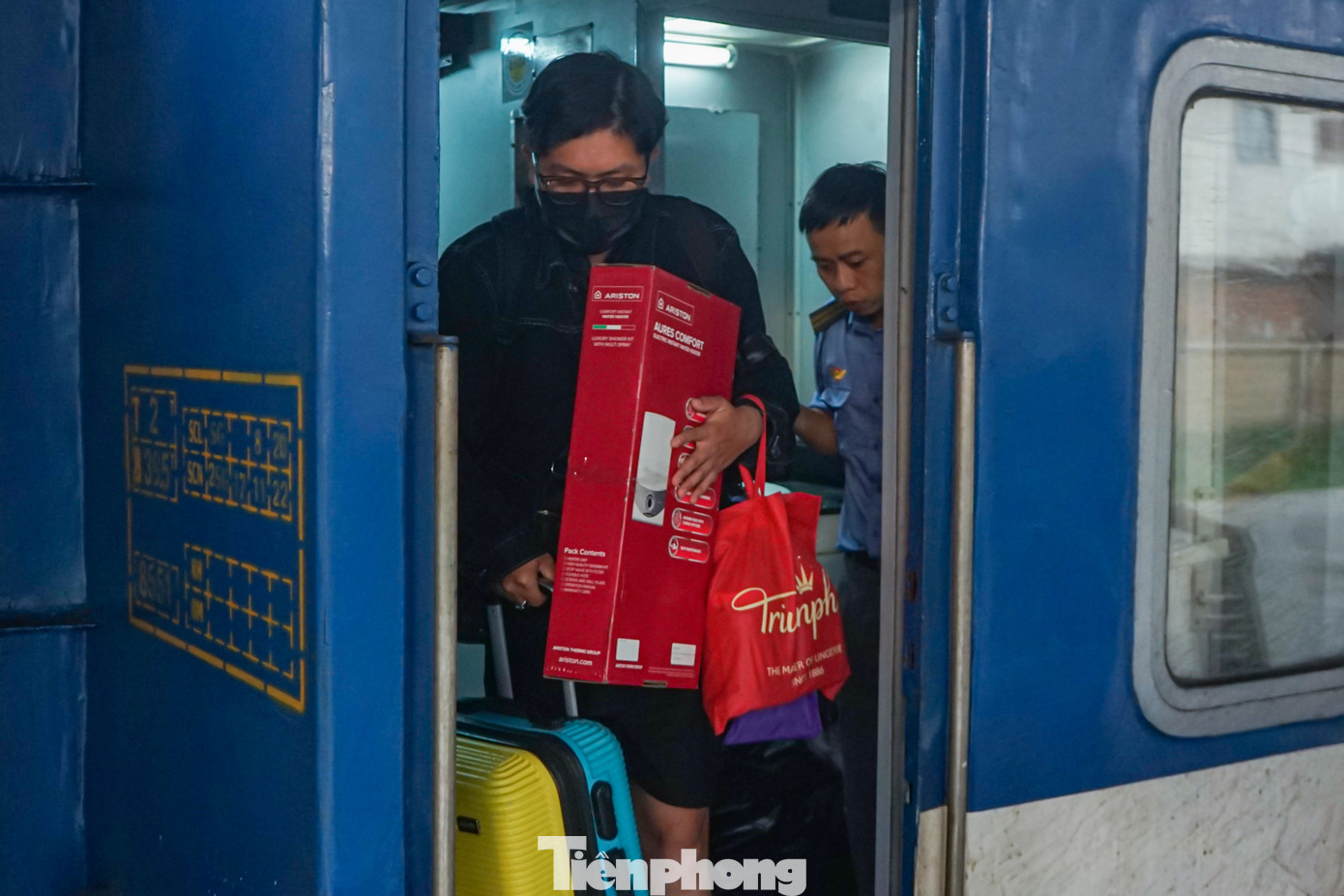 | Sau hồi còi dài, tàu SE7 (Hà Nội - TPHCM) dừng hẳn, hàng trăm lượt khách nhanh chóng kéo theo vali rời khỏi tàu. |