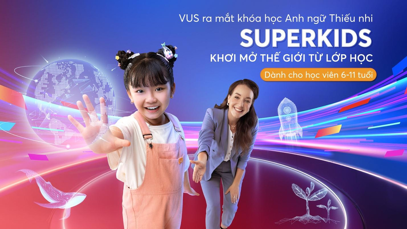 Sự ra mắt của khóa học đánh dấu bước chuyển mình của VUS trên hành trình khơi mở tương lai tươi sáng cho hàng triệu trẻ em Việt Nam. Với SuperKids thế hệ mới, VUS mang đến cho học viên từ 6-11 tuổi một khởi đầu vui học & đầy hứng khởi cùng tiếng Anh - nơi các em được kết nối với nguồn tri thức phong phú, bộ kỹ năng vững vàng và hàng ngàn trải nghiệm mang đậm dấu ấn tuổi thơ.