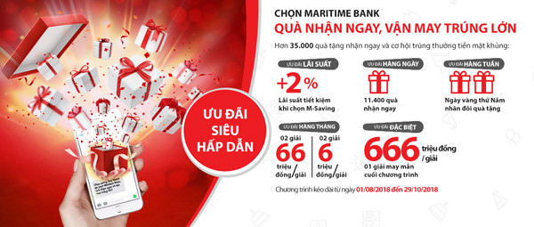 Tưng bừng chào đón sinh nhật lần thứ 27, Maritime Bank triển khai chương trình ưu đãi đặc biệt “Chọn Maritime Bank: Quà nhận ngay – Vận may trúng lớn” như một lời tri ân sâu sắc gửi đến khách hàng với hơn 35.000 quà tặng gồm: quà tặng tiền mặt nhận ngay mỗi ngày, ưu đãi hoàn tiền vào thứ Năm hàng tuần và cơ hội sở hữu quả “khủng” trong các chương trình quay số trúng thưởng hàng tháng và cuối chương trình.