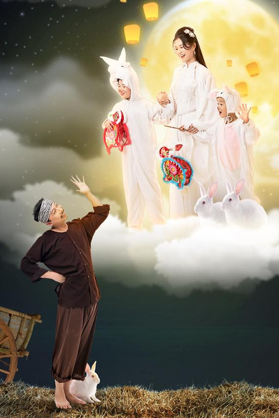 Gia đình Lâm Vỹ Dạ - Hứa Minh Đạt thực hiện bộ ảnh trung thu ấn tượng trong đó Hứa Minh Đạt vào vai chú Cuội, 2 nhóc tỳ là hai chú thỏ còn Lâm Vỹ Dạ là chị Hằng.