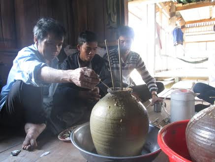 Theo tục lệ ở đây, nhà trai chỉ được phép ngồi góc bên trái và ở một khoảng hẹp ngay gần cửa chính. Nhà gái tùy điều kiện mà thết đãi rượu cần cho nhà trai. Thường thì nhà gái chịu 5-7 bình rượu cần để tiếp nhà trai từ tối tới sáng. Với nhà có điều kiện, nhà gái thết đãi nhà trai 12-13 hũ.