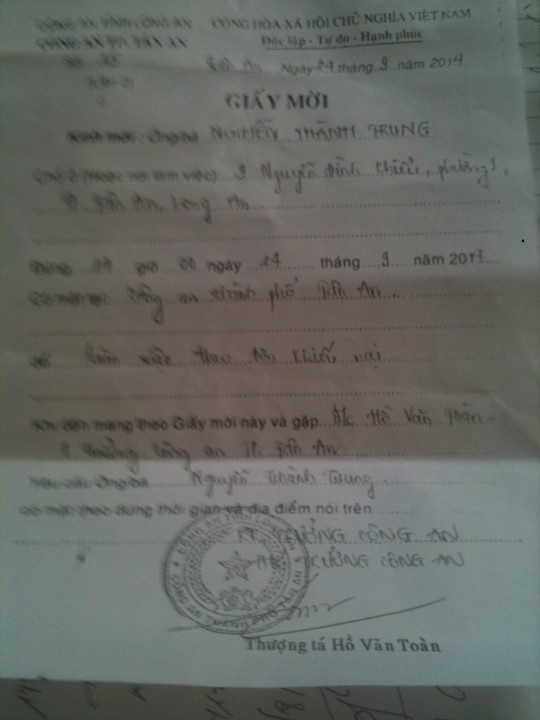Ngày 21/10, ông Nguyễn Thành Trung (ngụ phường 1, TP Tân An, Long An) cho biết ông gởi đơn khiếu nại trung úy Lê Chí Thông, công an phường Khánh Hậu, tháng 8/2014, đã trực tiếp đến gia đình mượn tiền 2 lần tổng cộng 100 triệu đồng với thời gian trả là một tháng.
