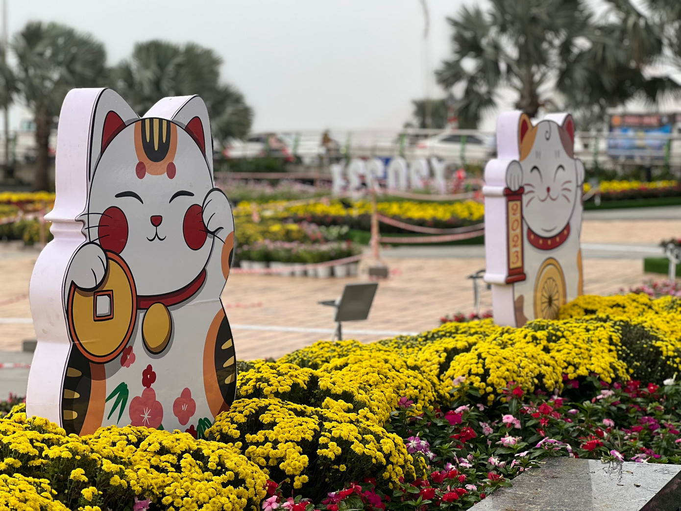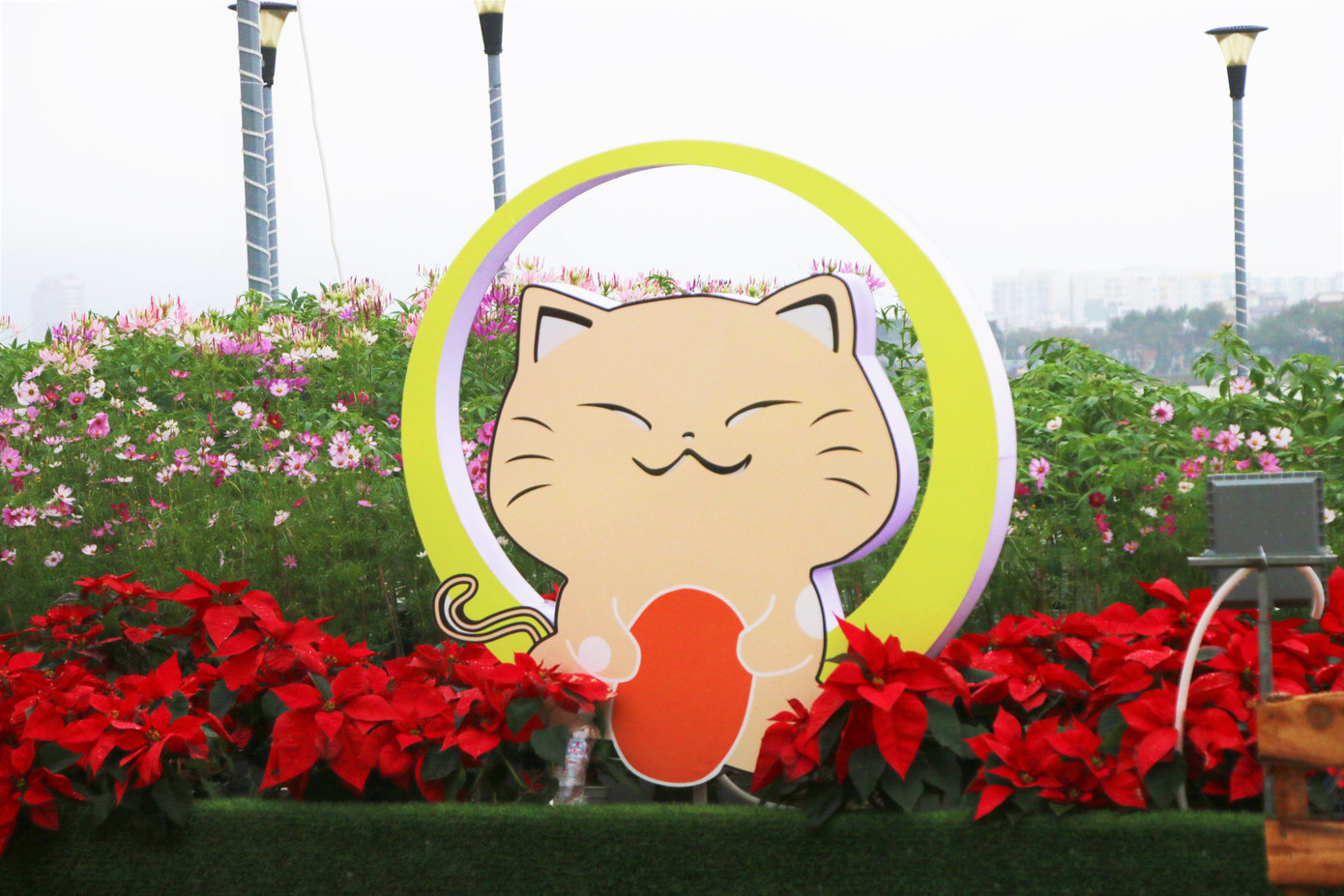 | Linh vật mèo với kiểu dáng khác được trang trí tại đường hoa Xuân phía chân cầu Rồng. |