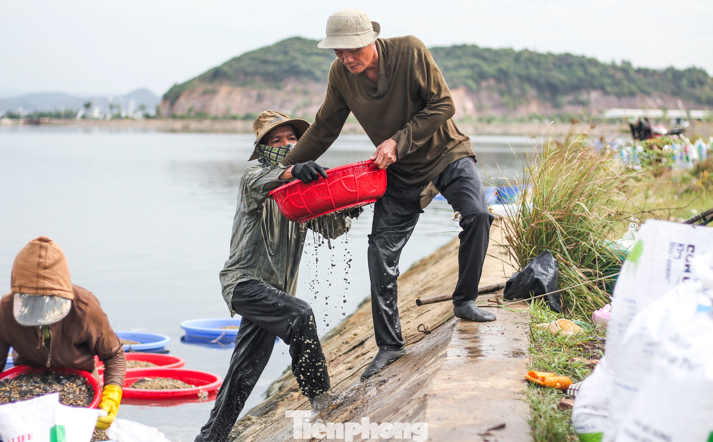 Khi hến đã sạch được cho vào bao tải, đưa vào bờ bán cho thương lái. Người dân cho biết, giá bán bình quân khoảng 70 ngàn đồng/1 bao (mỗi bao nặng khoảng 40kg) được người mua chở vào thị xã Sông Cầu (Phú Yên) để cho tôm hùm ăn. (Ảnh: Trương Định)