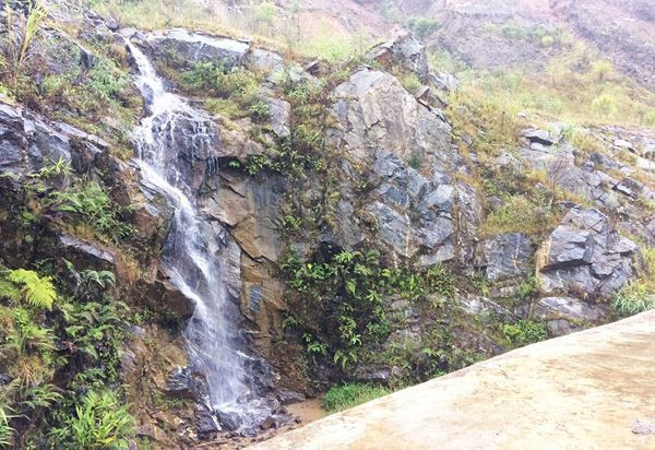 Trên đường đến xã Măng Ri, đoạn qua đèo Văn Rơi có những mạch nước tuôn xuống từ vách núi đá, trong veo, mát lạnh.