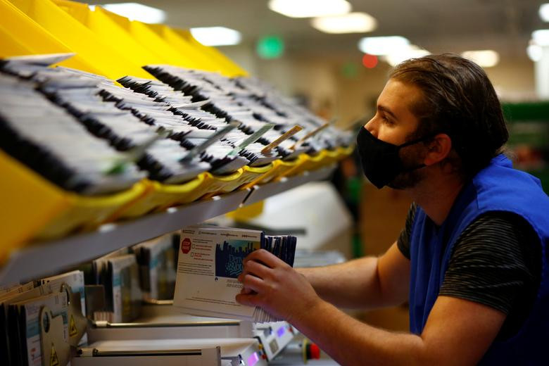 Một nhân viên kiểm phiếu xử lý phiếu bầu qua thư. Ảnh: Reuters
