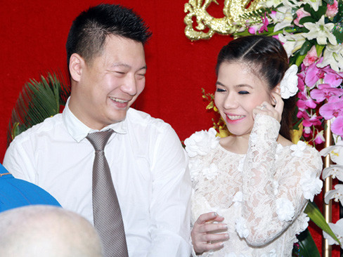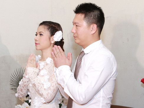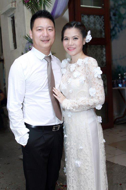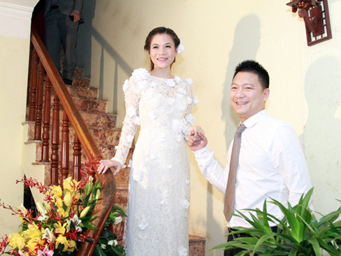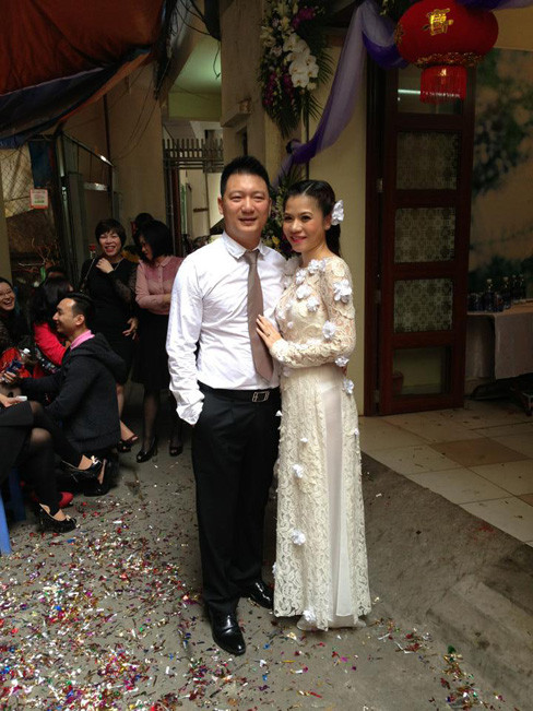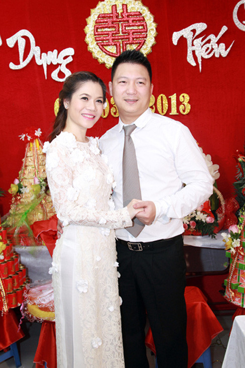 Mỹ Dung diện áo dài ren màu trắng đính hoa rất dịu dàng và xinh đẹp, sánh đôi cùng chú rể là một doanh nhân 35 tuổi trong đám hỏi.