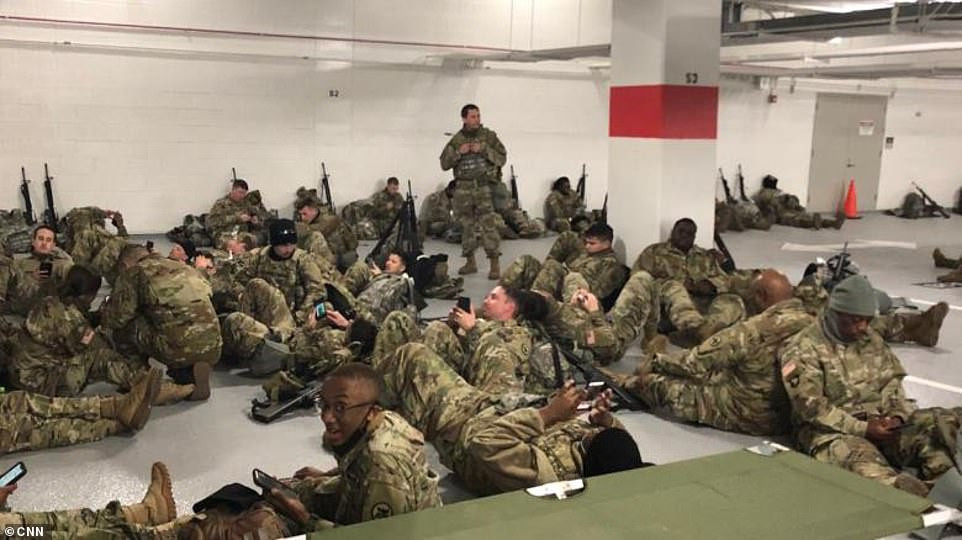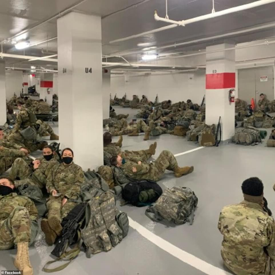 Các bức ảnh cho thấy có tới 5.000 binh sĩ Vệ binh chen nhau ngủ trên sàn của bãi đậu xe Tòa nhà Thurgood Marshall và trong công viên khi nhiệt độ chỉ khoảng 4 độ C.