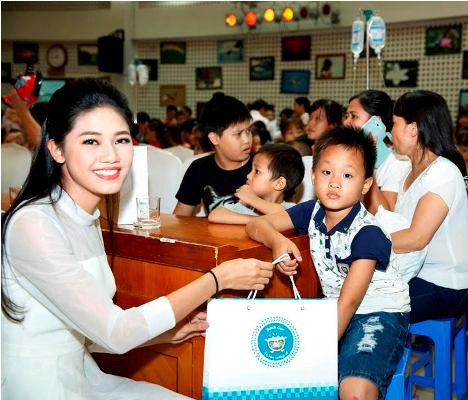 Hoa hậu Mỹ Linh cùng đại diện ban tổ chức là Tổng Biên tập báo Tiền Phong Lê Xuân Sơn và bà Thanh Hằng (Thanh Hằng Beauty Medi) trao quà cho các bệnh nhi.