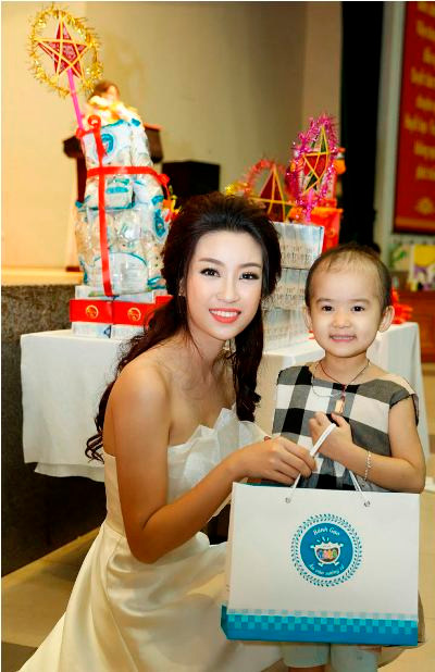 Hoa hậu Mỹ Linh trao quà cho bé.