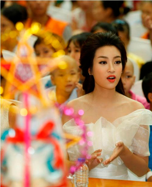Tân Hoa hậu Đỗ Mỹ Linh trang điểm nhẹ nhàng, mặc trang phục trắng ngà tham gia đêm hội của các bệnh nhi.