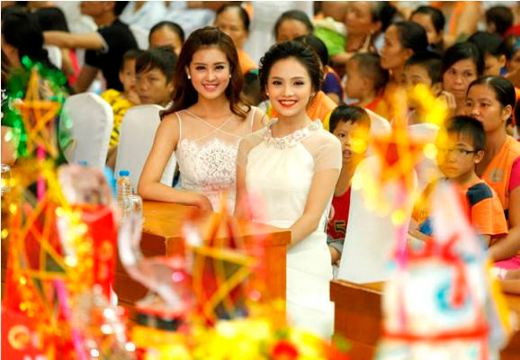 TPO - Tối ngày 14/9, tân Hoa hậu Việt Nam Đỗ Mỹ Linh cùng Á hậu Ngô Thanh Thanh Tú và dàn mỹ nhân chung vui với những bệnh nhi tại Viện Huyết học - Truyền máu T.Ư trong Chương trình “Vui tết Trung thu 2016”.