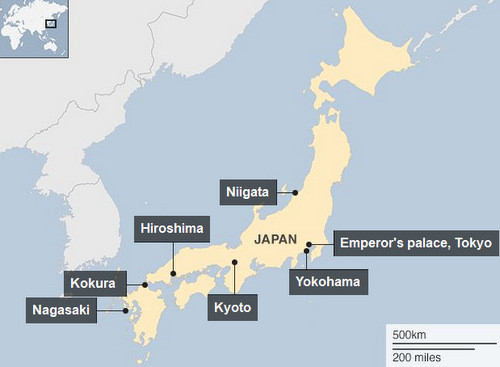 Các mục tiêu ở phía nam được nhắm tới, nhưng cố đô Kyoto được loại trừ. Bộ trưởng chiến tranh Mỹ Henry Stimson, người từng đi nghỉ tuần trăng mật tại đây, cho rằng không nên ném bom một trung tâm văn hóa quan trọng. Ủy ban mục tiêu quyết định chuyển hướng sang thành phố Hiroshima, nơi có căn cứ quân sự quan trọng và một cảng biển.