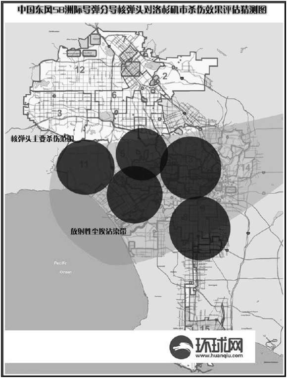Trong bài báo "Lần đầu tiên Trung Quốc sở hữu khả năng răn đe hạt nhân đối với Mỹ" đăng trên Thời báo Hoàn cầu ngày 13/10/2013, tác giả Pei Shen có kèm một bản đồ mô tả Los Angeles trong một cuộc tấn công hạt nhân của tàu ngầm lớp Tấn JL-2: "Sau khi tên lửa hạt nhân tấn công thành phố, bụi phóng xạ tạo ra bởi 20 đầu đạn hạt nhân sẽ tạo ra một khu vực nhiễm xạ hàng nghìn km".