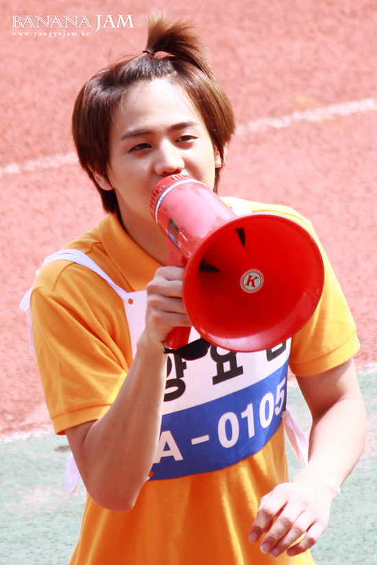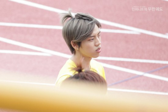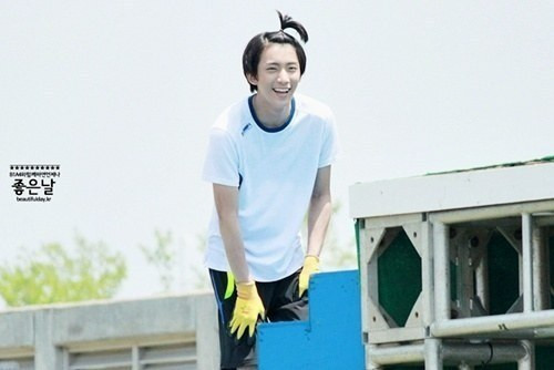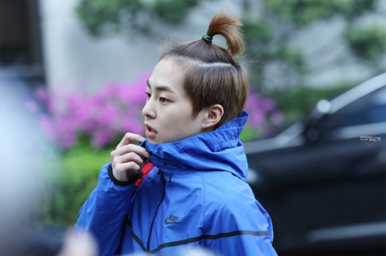 Anh chàng Yo Seob của (B2ST) chọn cách buộc hết mái lệch sang một bên để đỡ vướng víu, mát mẻ hơn khi tham gia các hoạt động thể thao.