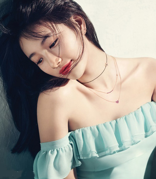 Ca sĩ Suzy khoe vẻ quyến rũ trong chiếc áo trễ vai màu xanh da trời.