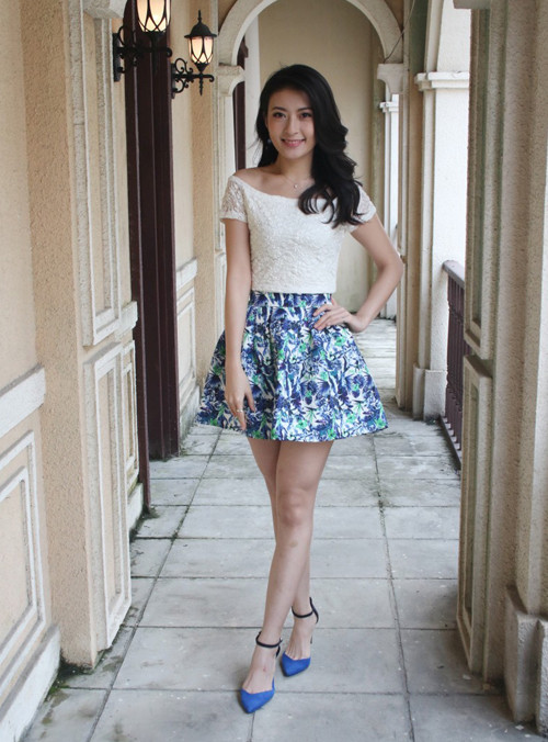 Lý Quân Nghiên, diễn viên TVB, phối giày cùng tông màu chân váy hoa, mang đến vẻ trẻ trung, ngọt ngào.
