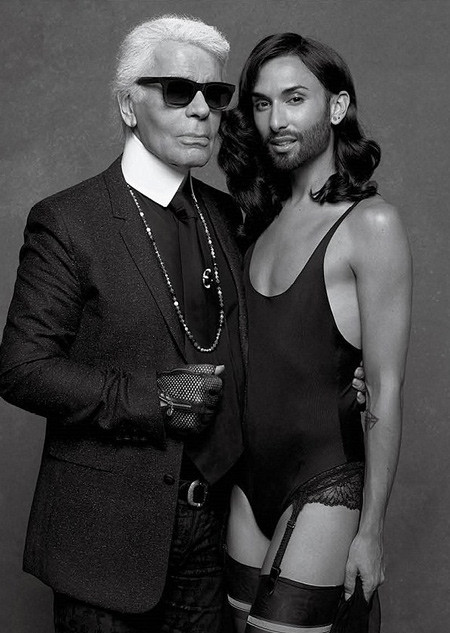 Nữ ca sĩ Conchita Wurst, quán quân của chương trình Eurovision năm 2014, xuất hiện trong bộ ảnh thời trang gợi cảm và khiêu khích cùng nhà thiết kế Karl Lagerfeld. Conchita Wurst không chỉ nổi tiếng nhờ giọng hát đặc biệt mà cả bởi phong cách thời trang rất ấn tượng của mình. Conchita Wurst là nam giới nhưng cô lại ăn mặc, trang điểm như phụ nữ khi xuất hiện trên sân khấu. Trái với vẻ ngoài nữ tính, Conchita Wurst vẫn giữ lại bộ râu quai nón nam tính.