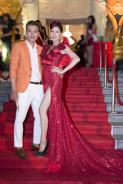 Người mẫu Trang Trần nổi bật trên thảm đỏ khi mặc chiếc đầm của nhà thiết kế Chung Thanh Phong, để lộ đôi chân thon dài. Cô chụp ảnh cùng Hiếu Nguyễn - bạn diễn trong phim 'Hương Ga'