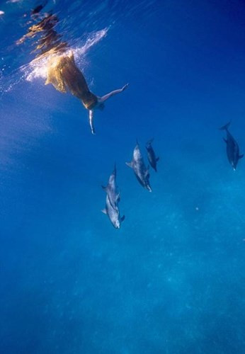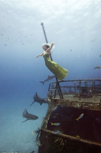 Trong loạt ảnh của Jeremy, những cô gái đẹp này cũng là những người có kinh nghiệm lặn, khoác lên mình bộ trang phục lộng lẫy, tha thướt cùng vui đùa, giao tiếp rất phiêu cùng với cá mập, cá voi, lợn biển, cá đuối... Hình ảnh này được chụp tại Cancun, Mexico.