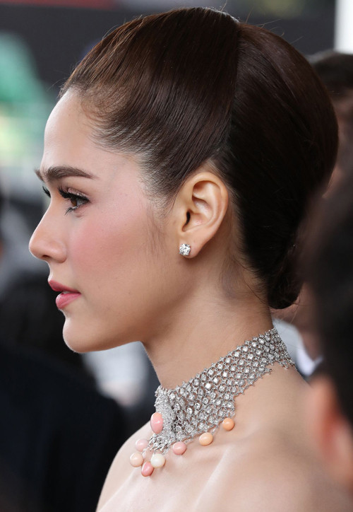 Minh tinh Thái chọn trang sức và lối trang điểm hài hòa cùng thiết kế.