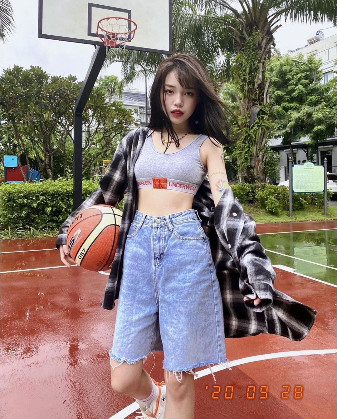 Linh Ngọc Đàm năng động khi mix nội y thể thao cùng quần soócjeans ống rộng và áo sơ mi kẻ sọc khoác ngoài.