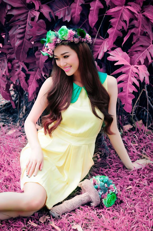 Người đẹp Khánh My đội vòng hoa sắc màu, diện áo gam vàng phù hợp khi thực hiện những hình ảnh mới.