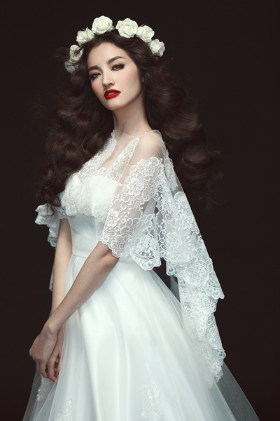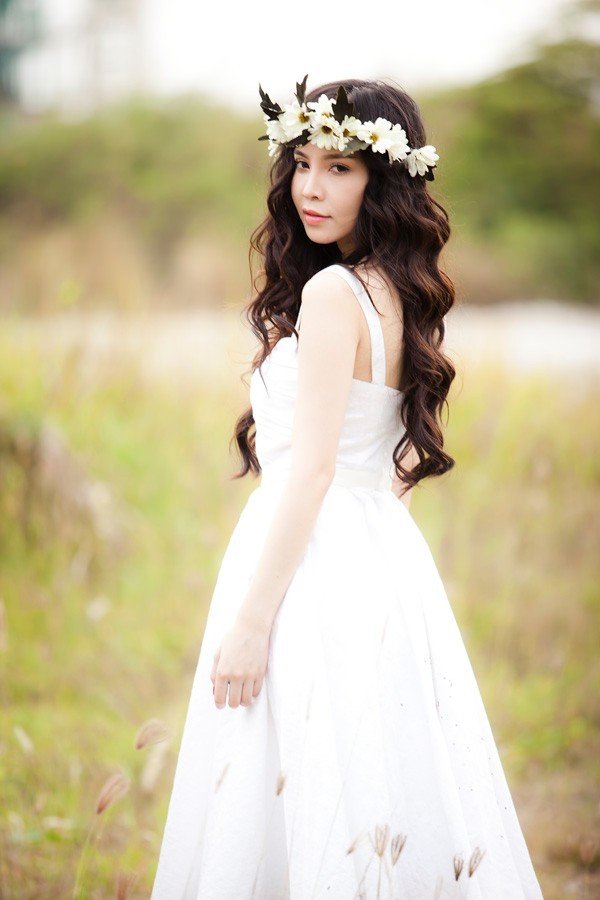 Khuôn mặt xinh xắn, cùng biểu cảm trong sáng của Ngọc Trinh rất phù hợp với phong cách lãng mạn, có vòng hoa kết trên tóc.