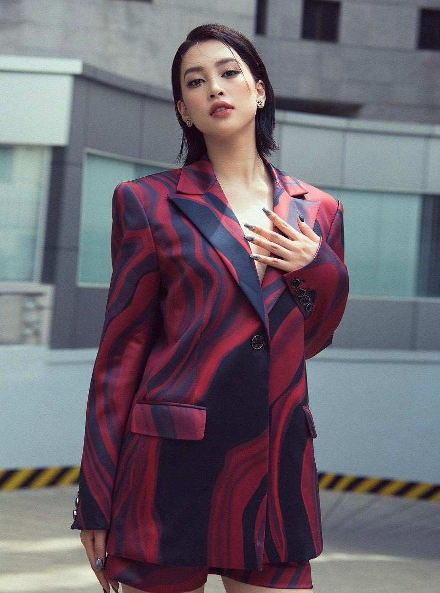 Tương tự Thùy Tiên, Hoa hậu Tiểu Vy cũng "chơi lớn" không phối thêm áo trong khi diện vest. Với mái tóc ngắn và layout trang điểm chủ yếu nhấn vào phần mắt, tổng thể outfit của Tiểu Vy tạo cảm giác quý phái, sang trọng mà không kém phần năng động.