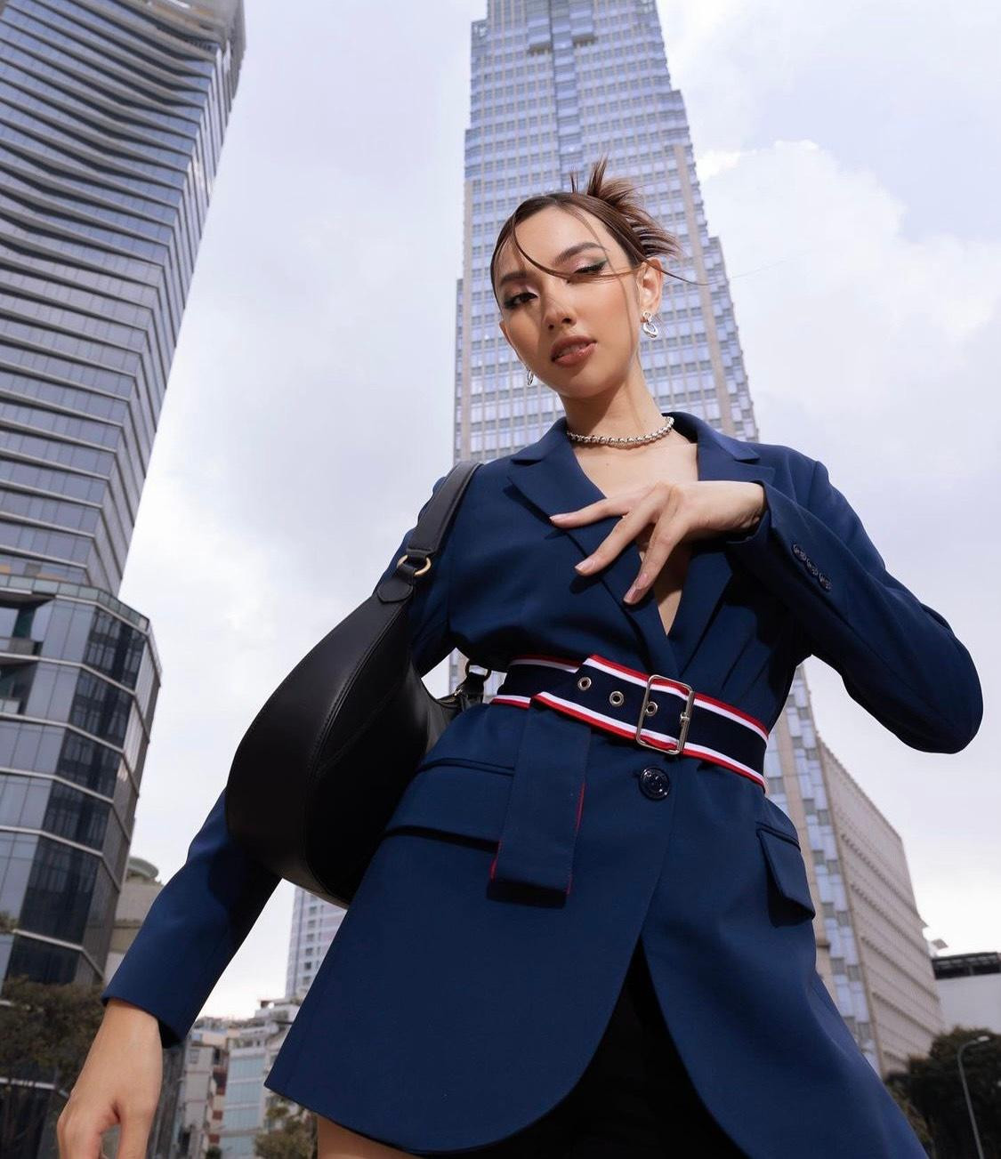Thùy Tiên gây ấn tượng khi chỉ mặc vest mà không phối thêm trang phục bên trong. Hoa hậu Hòa Bình Quốc Tế 2021 "biến hình" thành quý cô quyền lực với mái tóc được búi cao, tone make-up kiểu Tây và phụ kiện bằng bạc. Đặc biệt, chiếc thắt lưng được phối khéo léo vừa giúp tạo điểm nhấn cho tổng thể, vừa khoe được thân hình quyến rũ của nàng Hậu.