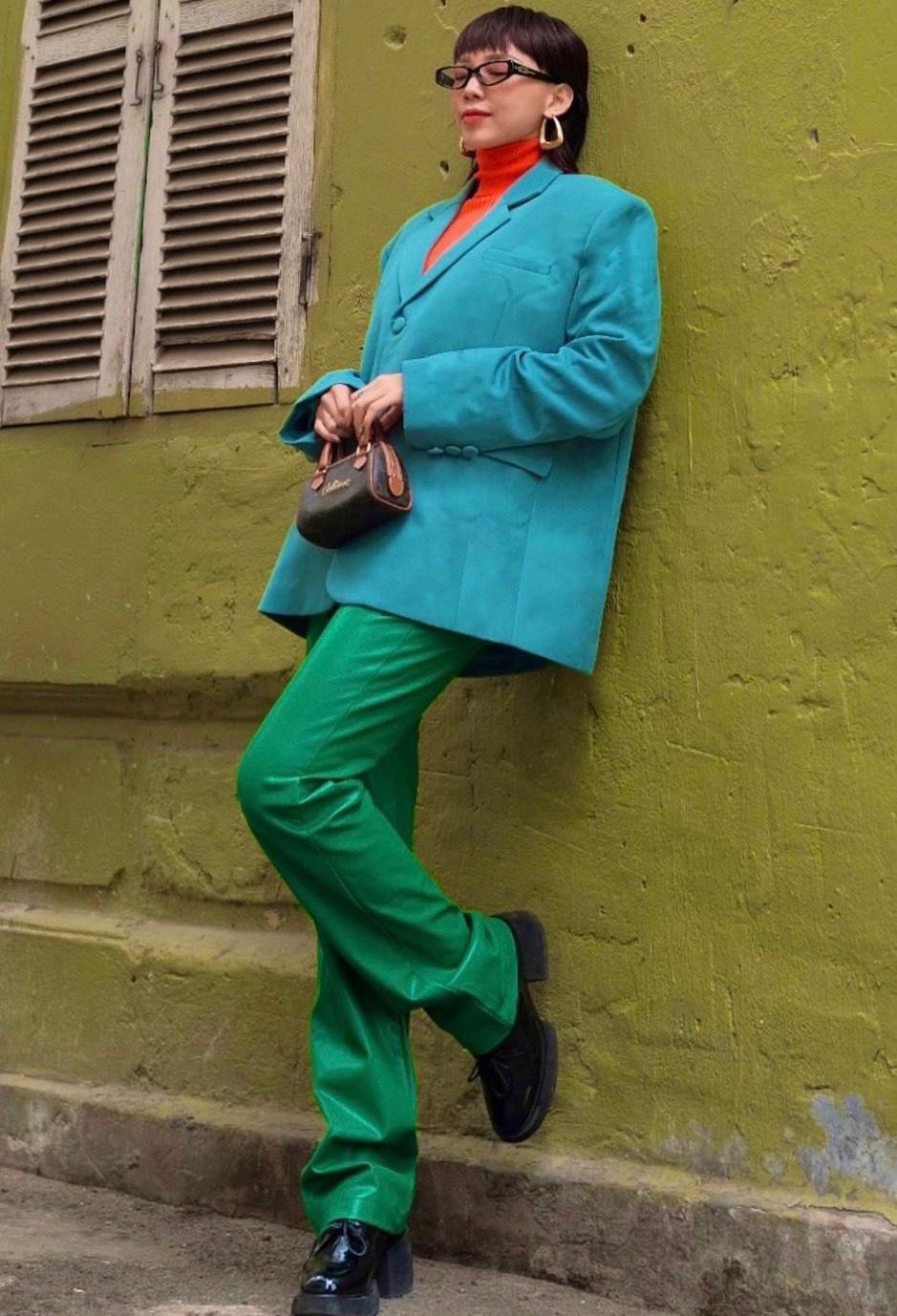 | "Đồng chí" Khánh Linh "cháy phố" với sơ mi đỏ mặc trong phối cùng vest hồng và túi xách xanh neon rực rỡ. |
