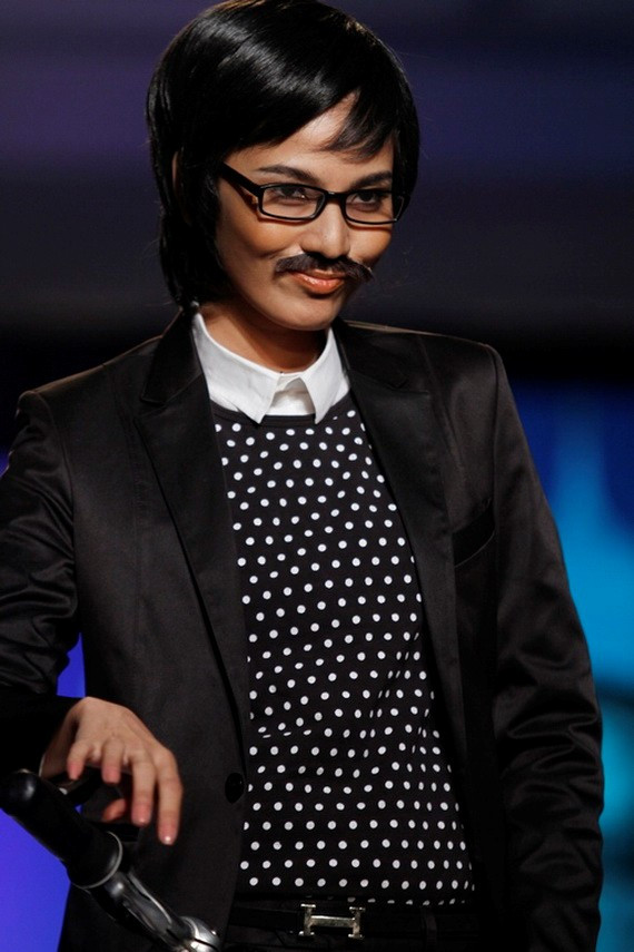 Người đẹp mặc vest, dán râu giả hóa trang làm một người mẫu nam, sải bước tự tin, mạnh mẽ trong một chương trình thời trang.