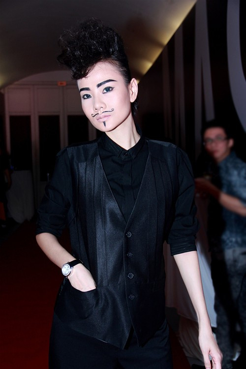 Dương Yến Ngọc từng gây ấn tượng với phong cách trang điểm nam tính và mạnh mẽ. Bộ ria mép được tô vẻ tỉ mỉ giúp cô trở thành tâm điểm của buổi tiệc.