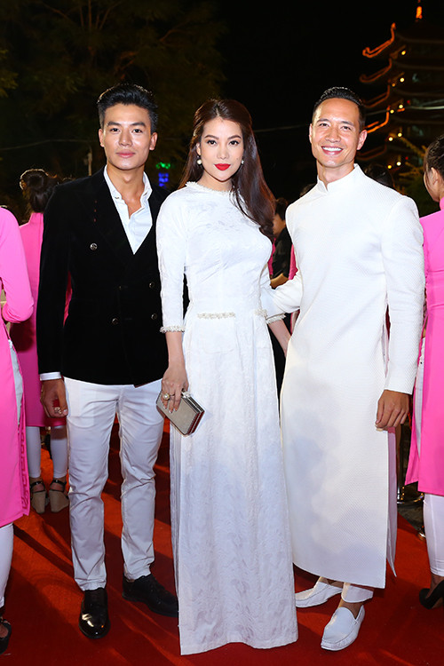 Diễn viên Trương Ngọc Ánh đồng hành cùng Hiếu Nguyễn (trái) và Kim Lý xuất hiện tại buổi khai mạc. Bộ phim "Hương Ga" của Trương Ngọc Ánh nằm trong số phim truyện điện ảnh tranh giải năm nay.