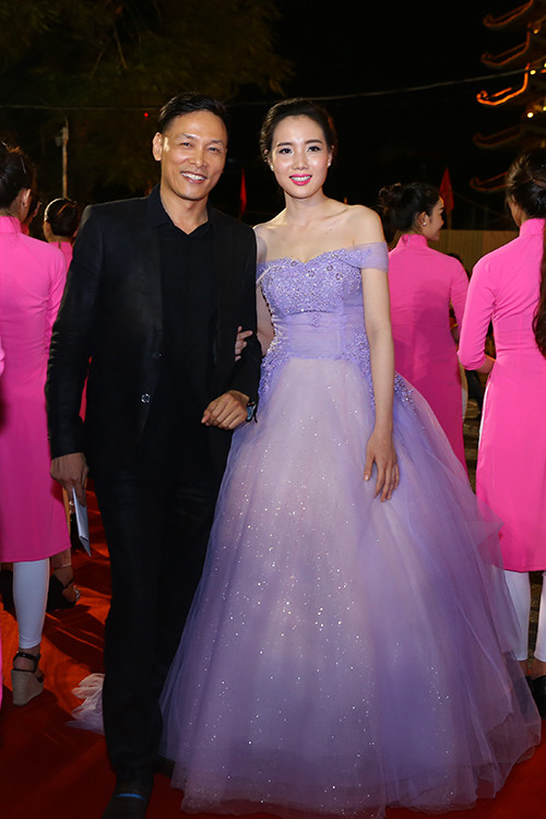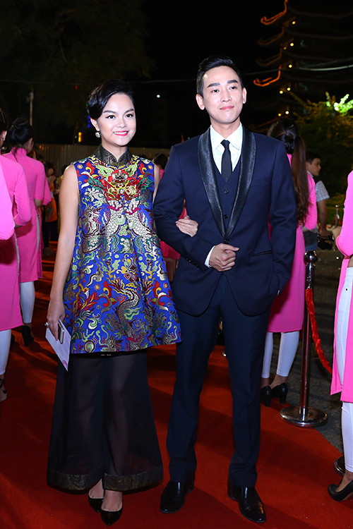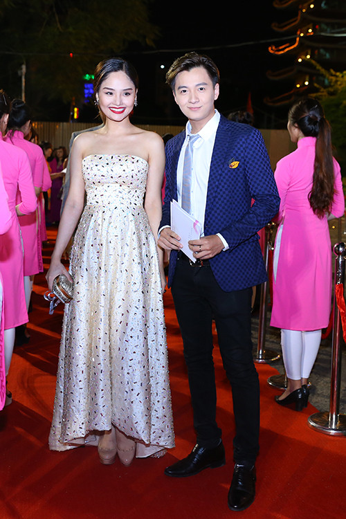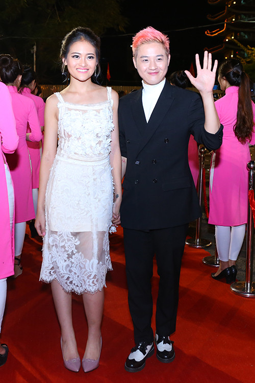 Người đẹp Miu Lê (trái) đến dự lễ khai mạc cùng Ngô Kiến Huy. Cả hai cùng là diễn viên của bộ phim "Em là bà nội của anh" - tác phẩm được chiếu phục vụ khán giả ở chương trình toàn cảnh của Liên hoan.
