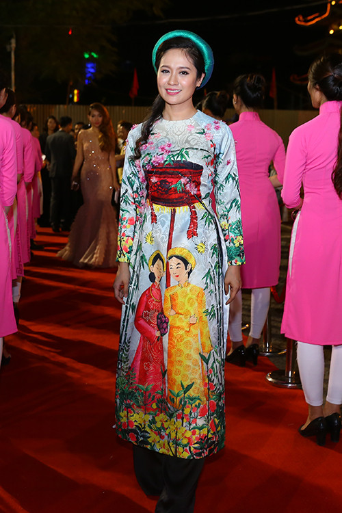 Diễn viên, nhà sản xuất Thanh Thúy diện áo dài cách điệu với các họa tiết mang đậm nét dân gian, truyền thống.