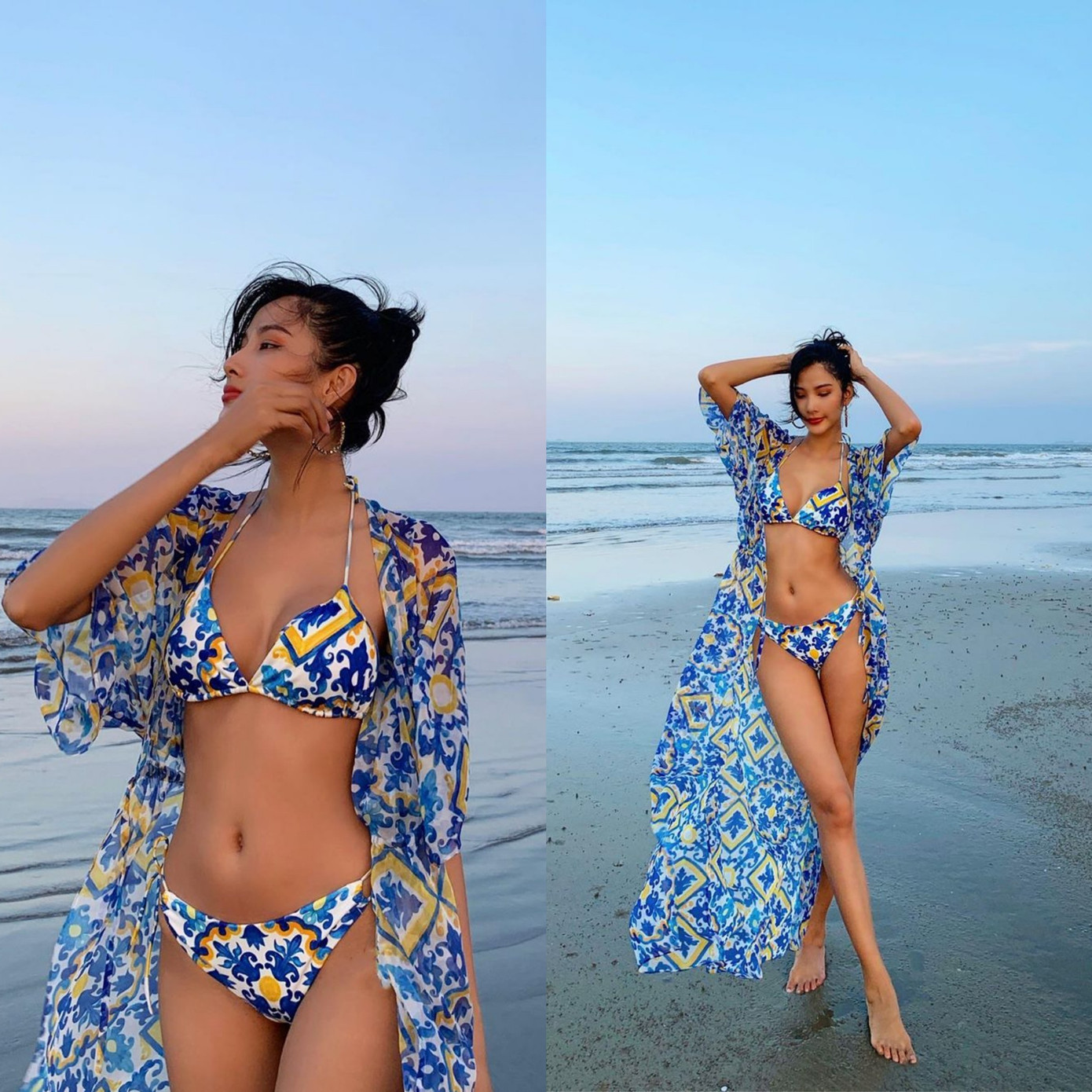 Hoàng Thùy tạo dáng siêu đỉnh với bikini hai mảnh họa tiết bắt mắt, người đẹp cũng khoe trình tạo dáng đẳng cấp của mình trên bãi biển.