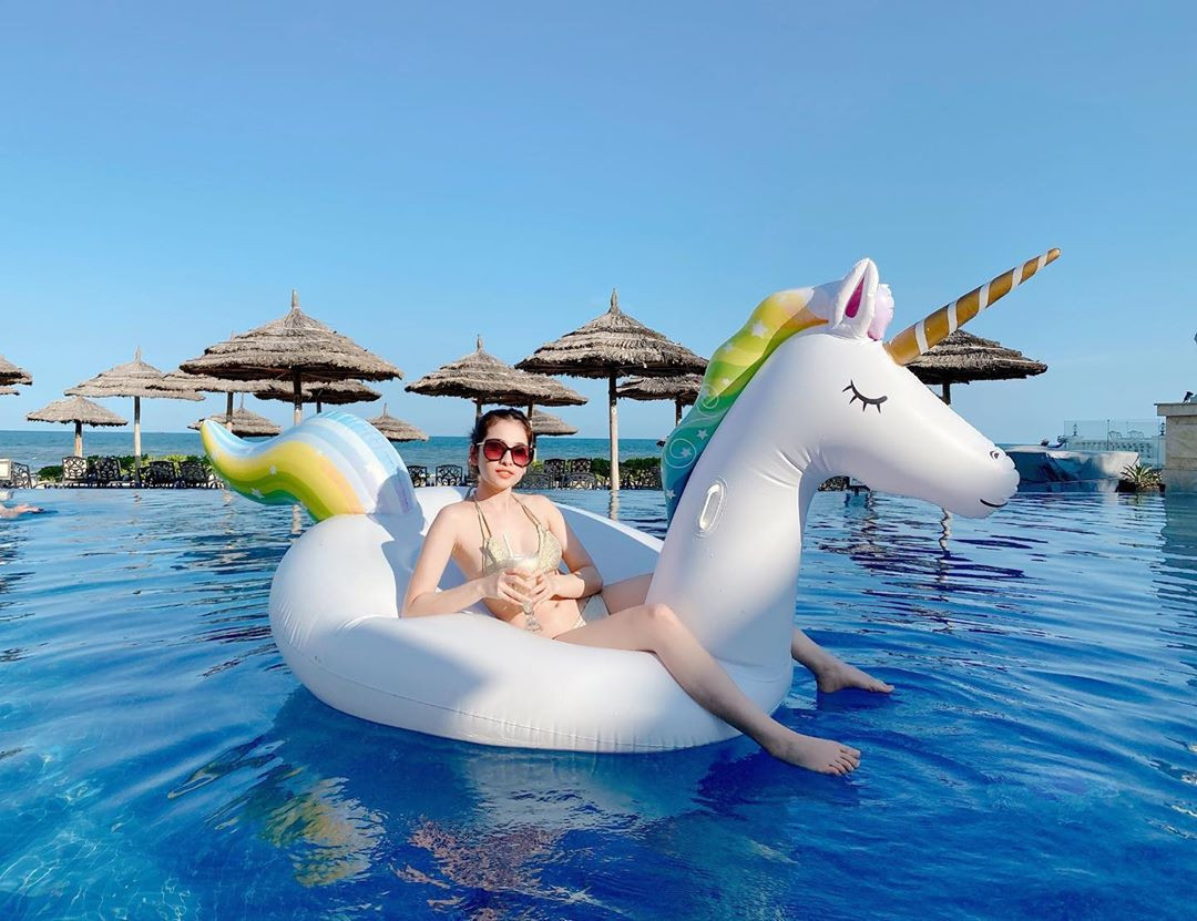 Nữ ca sĩ Sara Lưu khoe đôi chân nuột với mẫu áo tắm màu vàng kim cực gợi cảm, thoải mái thả dáng với phao bơi unicorn siêu dễ thương.