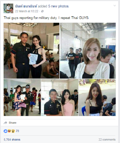 Hôm 22/3, một người có tên Nant Thananan chia sẻ loạt ảnh những chàng trai chuyển giới người Thái Lan đi xét tuyển nghĩa vụ quân sự trên Facebook cá nhân.