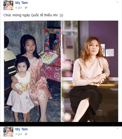 "Họa mi tóc nâu" gây "bão mạng" khi tung bức ảnh lúc nhỏ. Lúc này Mỹ Tâm 13 tuổi, cô diện bộ váy hồng điệu đà ngồi vắt chéo chân. Việc nữ ca sĩ ghép tấm hình hiện tại của cô bên cạnh cũng tư thể đó khiến fan hâm mộ không khỏi thích thú.
