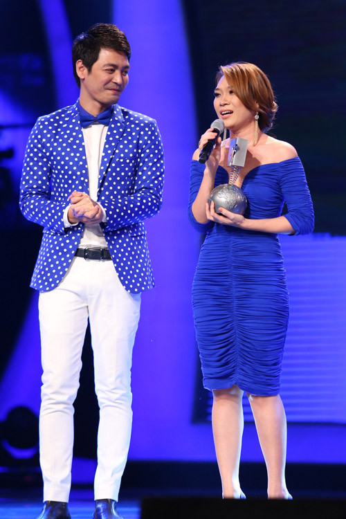 'Họa mi tóc nâu' khoe chiếc cúp trong sự vui mừng của đông đảo khán giả có mặt tại trường quay